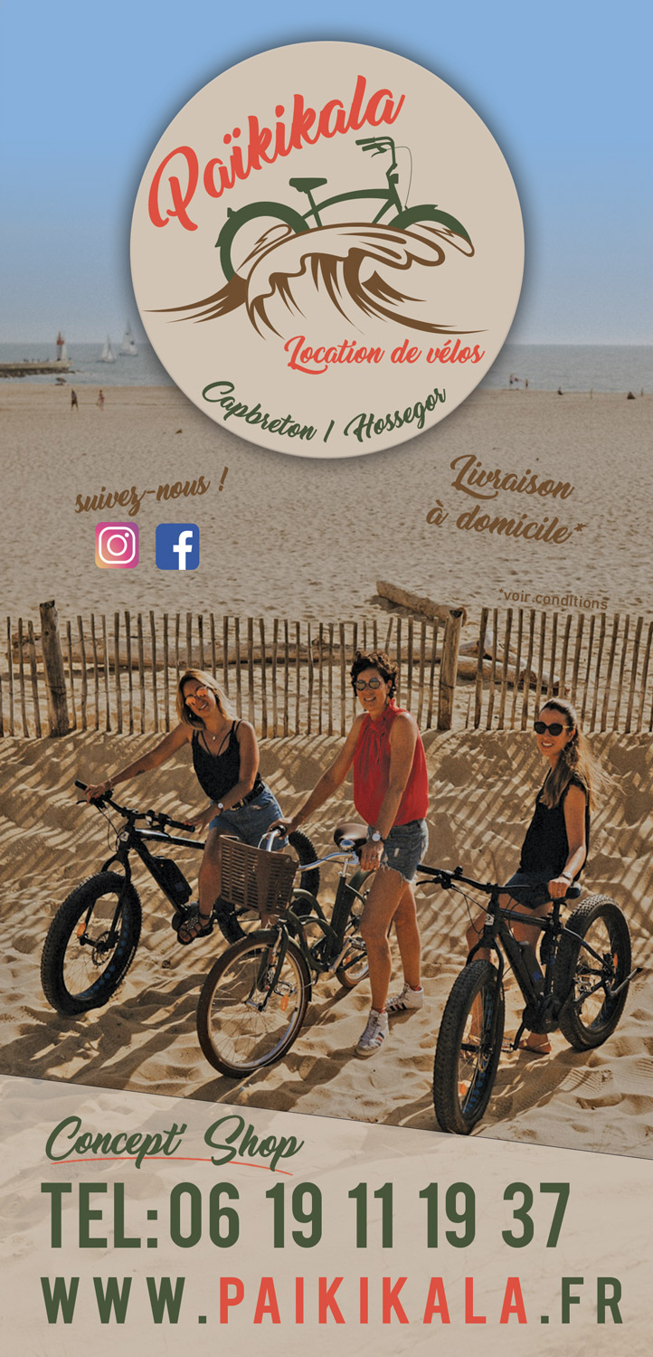 Envie de vous mettre les pieds en éventail en sirotant un bon cocktail face à l'océan ? Pour cela pensez Païkikala ! Venez louer nos beaux vélos ! Un pour chaque personnalité. Solitaire ou en tribu, au gré de vos envies nous réalisons vos rêves d'évasion. Tous les types de vélos vous attendent : Hollandais, VTC, Beach bike, VAE, FAT Bike, Tandem… Nous vous livrons ou RDV en Boutique. Bref, laissez parler votre cœur…"
